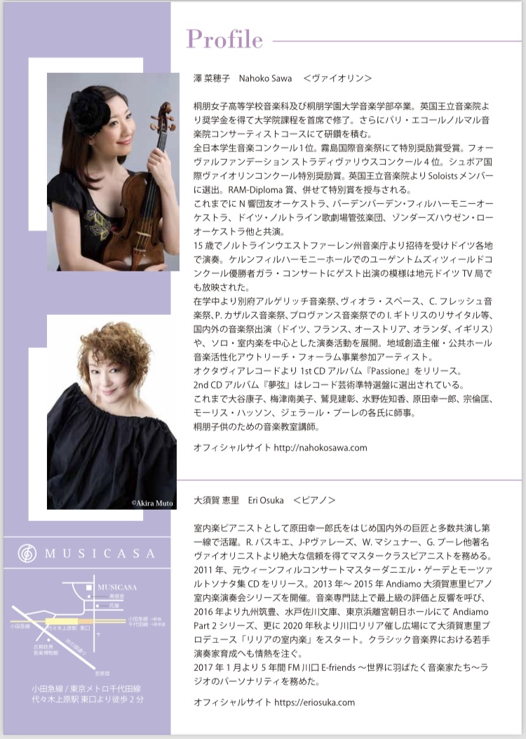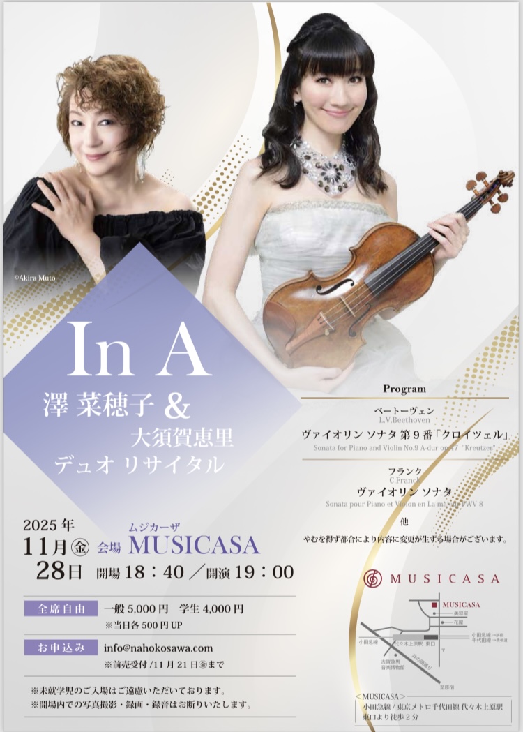 【出演】澤 菜穂子(ヴァイオリン) 大須賀恵里 (ピアノ) 【日時】2025年11月28日(金) 19時開演 (18:40開場) 【会場】MUSICASA (ムジカーザ) 小田急線/東京メトロ千代田線 代々木上原駅 東口より徒歩2分 【料金】一般 ¥5,000(前売) 学生¥4,000(前売) 当日 各500円up ※全席自由 【お申込み】お名前と人数(学生の方は明記下さい)を info@nahokosawa.com のメールアドレスまでご連絡ください。 ※前売受付は11月21日(金)までとさせて頂きます。 【プログラム】 ベートーヴェン: ヴァイオリン ソナタ 第9番 「クロイツェル」 Beethoven: Violin Sonata No.9 "Kreutzer" フランク: ヴァイオリン ソナタ Franck: Violin Sonata 他 ♦︎やむを得ず都合により内容に変更が生ずる場合がございます。 ♦︎未就学児のご入場はご遠慮いただいております。 ♦︎開場内での写真撮影・録音・録音はお断りします。